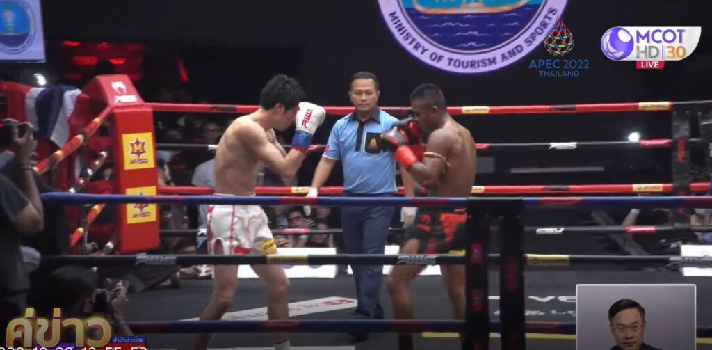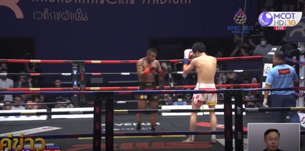 ก่อนชก บัวขาวออกมาโชว์ลีลาการไหว้ครูมวยไทย เรียกเสียงปรบมือจากแฟนมวยทั้งชาวไทยและต่างชาติที่เข้ามาเชียร์กันเต็มความจุของเวทีมวยราชดำเนิน