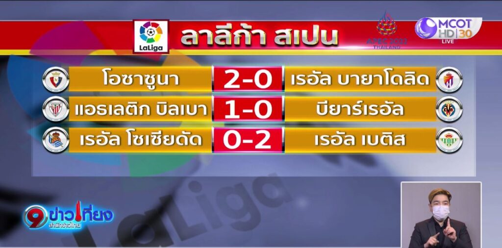 ฟุตบอลลา ลีกา สเปน เรอัล มาดริด เปิดรังซานติอาโก เบร์นาเบว เสมอกับ คิโรนา 1-1 เกมนี้มีประตูเกิดขึ้นในช่วงครึ่งหลัง นาทีที่ 70 “ราชันชุดขาว” มาได้ประตูขึ้นนำ 1-0 จาก วินิซิอุส จูเนียร์ แต่ในนาทีที่ 80 ทีมเยือนมาตามตีเสมอเป็น 1-1 จากจุดโทษของ คริสเตียน สตูอานี ในช่วงทดเวลาบาดเจ็บ เจ้าถิ่นต้องเหลือ 10 คนหลัง โทนี โครส โดนใบเหลืองที่ 2 กลายเป็นใบแดงไล่ออกจากสนามไป จบเกม เรอัล มาดริด มีเพิ่มเป็น 32 คะแนนจาก 12 นัด นำเป็นจ่าฝูง โดยนำ บาร์เซโลนา ที่อยู่อันดับ 2 แค่แต้มเดียว ส่วน คิโรนา เตะ 12 เกมมี 10 คะแนน อยู่ที่ 16 ของตาราง. – สำนักข่าวไทย