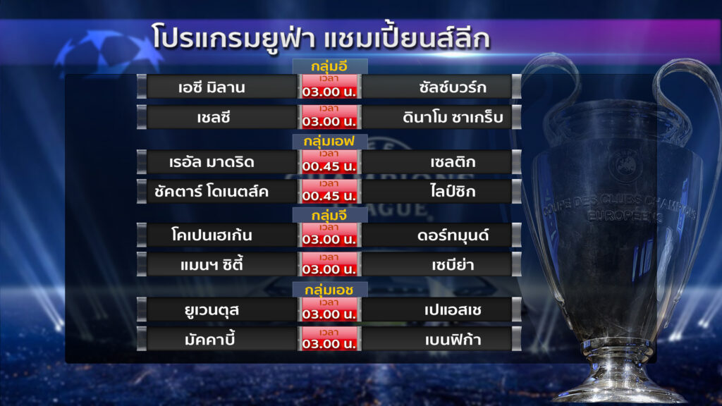 ฟุตบอลยูฟ่า แชมเปียนส์ ลีก รอบแบ่ง กลุ่มนัดสุดท้าย คู่ที่น่าสนใจเวลา 03.00 น. เกมกลุ่มเอช ยูเวนตุส อันดับ 3 ของกลุ่มจากอิตาลี จะเปิดบ้านพบ ปารีส แซงก์ แชร์กแมง จ่าฝุงของกลุ่มจากฝรั่งเศสเกมนี้ “ม้าลาย” หมดสิทธิ์เข้ารอบเรียบร้อย แต่ต้องชนะไว้ก่อนเพื่อลุ้นไปเล่นยูโรปา ลีก ส่วน เปแอสเช ต้องการ 3 แต้ม เพื่อตำแหน่งแชมป์กลุ่ม