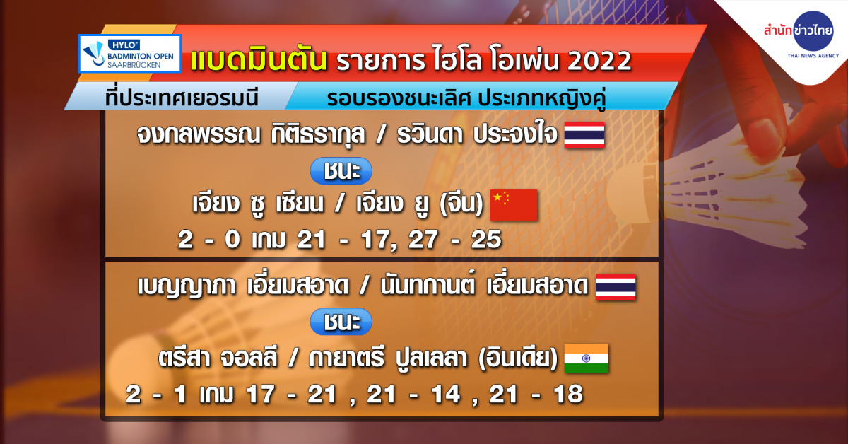 แบดมินตัน รายการ ไฮโล โอเพ่น 2022 ที่ประเทศเยอรมนี รอบรองชนะเลิศ ประเภทหญิงคู่ “กิ๊ฟ” จงกลพรรณ กิติธรากุล กับ “วิว” รวินดา ประจงใจ มือวางอันดับ 1 ของรายการ และมืออันดับ 7 ของโลก เอาชนะ เจียง ซู เซียน กับ เจียง ยู มือวางอันดับ 4 ของรายการจากจีน 2-0 เกม 21-17, 27-25 ผ่านเข้าชิงชนะเลิศ ไปพบกับ พี่น้องเอี่ยมสอาดอย่าง “มูนา” เบญญาภา กับ “อันนา” อันนา นันทน์กาญจน์ ที่เอาชนะ ตรีสา จอลลี กับ กายาตรี โกพิชาด ปูลเลลา จากอินเดีย 2-1 เกม 17-21, 21-14, 21-18 .-สำนักข่าวไทย