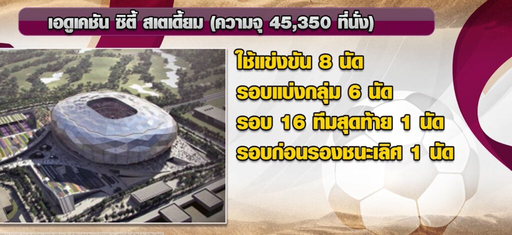 เอดดูเคชัน ซิตี สเตเดียม 1 ใน 8 สนามฟุตบอลโลก 2022 มีความจุ 45,350 ที่นั่ง ตั้งอยู่เมืองอัล รายยาน ภายในบริเวณของ Qatar Foundation ถูกออกแบบให้มีลักษณะคล้ายเพชร สามารถเปล่งแสงระยิบระยับได้ทั้งกลางวันและกลางคืน สนามแห่งนี้จึงถูกตั้งฉายาให้ว่า “เพชรในทะเลทราย”