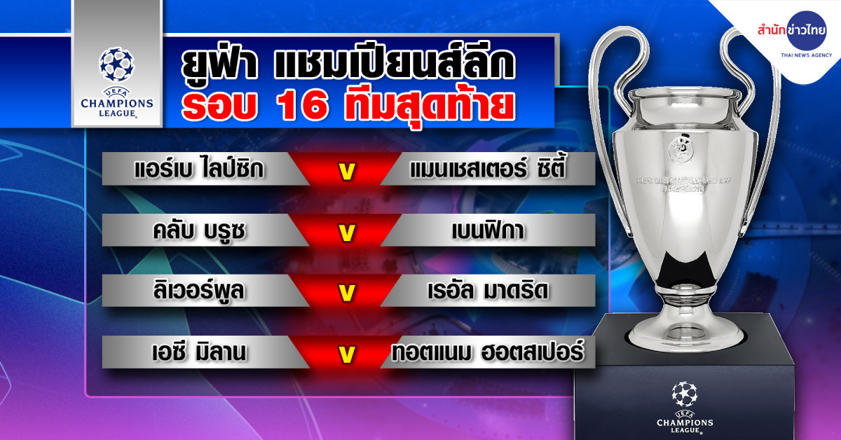 ฟุตบอลยูฟ่า แชมเปียนส์ ลีก UCL 2022/23 ได้บทสรุป 16 ทีมสุดท้ายเป็นที่เรียบร้อย และในวันนี้ (7 พ.ย.) มีการจับสลากประกบคู่ในรอบน็อกเอาท์ ซึ่งเงื่อนไขของการพบกันในรอบนี้ทีมที่มาจากลีกเดียวกัน ประเทศเดียวกัน จะไม่ถูกจับสลากมาเจอกัน และทีมที่มาจากกลุ่มเดียวกันจะไม่พบกันในรอบนี้
