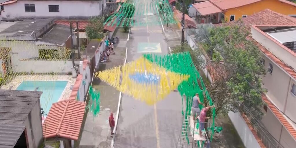 แฟนบอลชาวบราซิล ในย่านกัวปิมิริม นอกเมืองริโอเดจาเนโร ร่วมกันตกแต่งบรรยากาศบนท้องถนนถนนวอลเทเมียร์ โดยใช้กระดาษตกแต่ง รวมทั้งทาสีบนท้องถนนเป็นสีเหลือง สีเขียว สีขาว เป็นสีประจำชาติบราซิล บางถนนบริเวณฟุตบาทได้ใช้สีทาเป็นสัญลักษณ์ของธงชาติ เพื่อเตรียมพร้อมสำหรับการเข้าบรรยากาศฟุตบอลโลก 2022