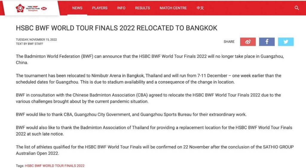 ทั้งนี้ สหพันธ์แบดมินตันโลกได้หารือกับ ฃสมาคมแบดมินตันจีน (CBA) และตกลงที่จะย้ายการแข่งขันเอชเอสบีซี บีดับเบิลยูเอฟ เวิลด์ ทัวร์ ไฟนอลส์ 2022 เนื่องจากอุปสรรคหลายด้าน โดยเฉพาะสถานการณ์การแพร่ระบาดของโควิด-19 ในปัจจุบัน