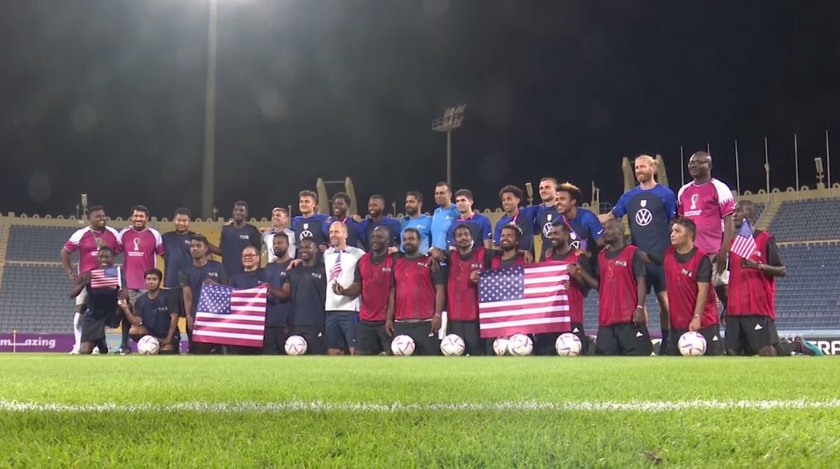 ด้านการฝึกซ้อมของทีมชาติสหรัฐอเมริกา ที่สนามอัล การาฟา สเตเดียม ในกรุงโดฮา มีความพิเศษเกิดขึ้น เมื่อมีการอนุญาตให้เหล่าคนงานก่อสร้างผู้อพยพในประเทศกาตาร์ ได้เข้ามาร่วมทำกิจกรรมพบปะนักเตะ และลงเล่นฟุตบอลร่วมกัน โดยมี คริสเตียน พูลิซิช, ทิม รีม และผู้เล่นดาวดังรายอื่นๆ ร่วมลงสนามด้วย. – สำนักข่าวไทย