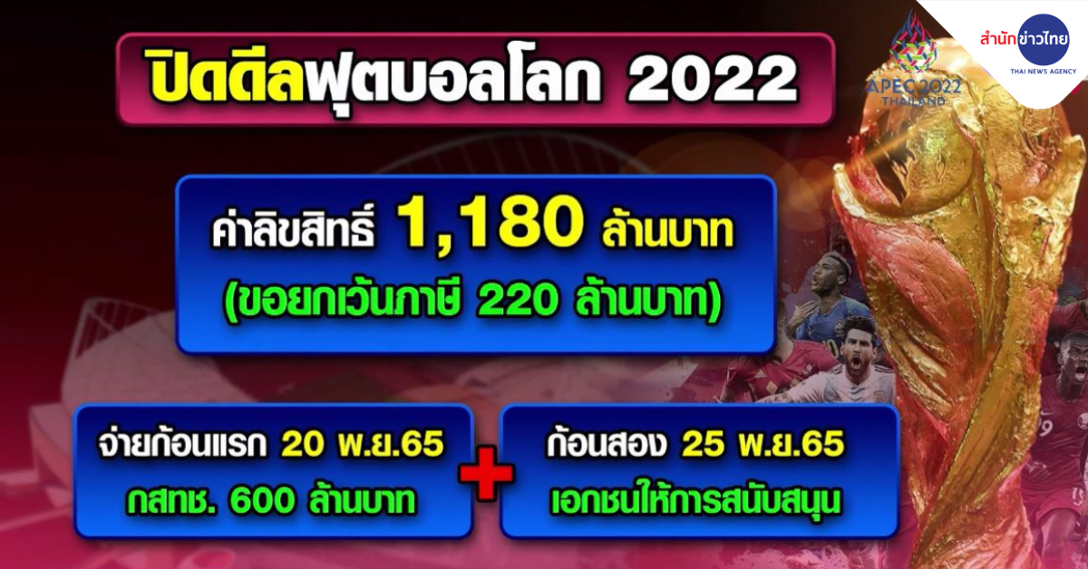 ความคืบหน้าการซื้อลิขสิทธิ์ถ่ายทอดสดฟุตบอลโลก 2022 รอบสุดท้าย ที่ประเทศกาตาร์ ระหว่างวันที่ 20 พฤศจิกายน – 18 ธันวาคม 2565 ภายหลังการกีฬาแห่งประเทศไทย บรรลุข้อตกลงปิดดีลในการซื้อลิขสิทธิ์ได้เป็นที่เรียบร้อยแล้ว ด้วยวงเงิน 33 ล้านดอลลาร์สหรัฐ หรือราว 1,200 ล้านบาท โดยยังไม่รวมค่าภาษีและค่าดำเนินการต่างๆ อีกประมาณ 200 ล้านบาท