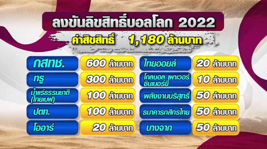 ผู้ว่าการ กกท.เผยว่า การที่รัฐบาลและภาคเอกชนพยายามซื้อลิขสิทธิ์ถ่ายทอดสดการแข่งขัน ก็เพื่อต้องการให้คนไทยทุกคนได้รับชมอย่างเท่าเทียมและทั่วถึง จากการที่มีผู้สนับสนุนเข้ามาเพิ่มเติมอีก 6 ราย ทำให้งบประมาณจากผู้สนับสนุนครอบคลุมค่าลิขสิทธิ์ที่ 33 ล้านดอลลาร์สหรัฐ หรือประมาณ 1,200 ล้านบาท โดยไม่ต้องดึงงบของกองทุนพัฒนากีฬาแห่งชาติมาใช้ ซึ่งจะไม่มีผลกระทบต่อนักกีฬาทีมชาติไทยอย่างแน่นอน และเชื่อว่าจากการถ่ายทอดสดฟุตบอลโลก จะช่วยให้มีเม็ดเงินสะพัดในช่วงการ ราวๆ 3-4 หมื่นล้านบาท สำหรับการกระตุ้นเศรษฐกิจ