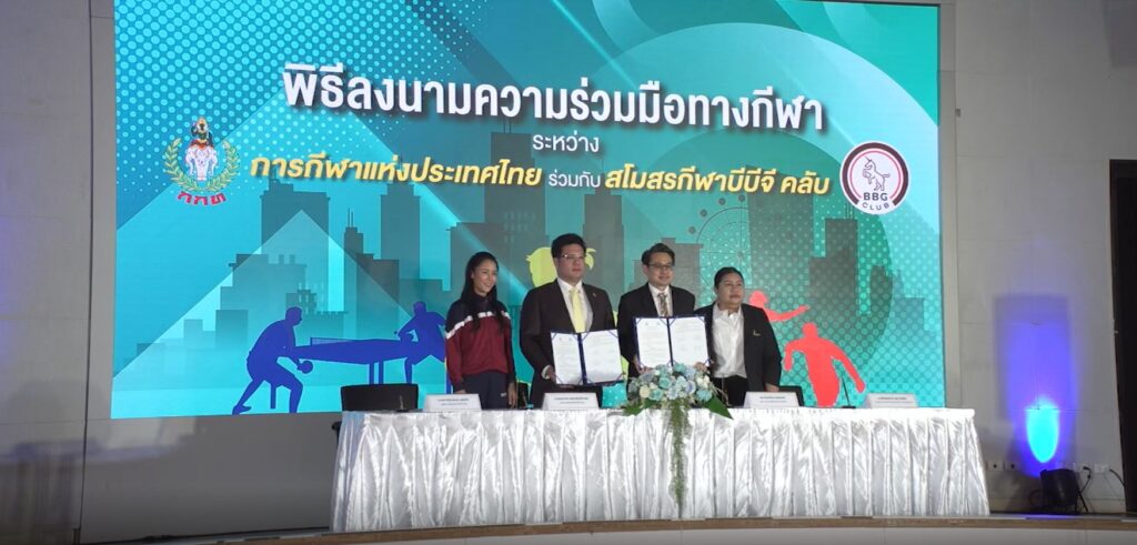 ดร.ก้องศักด ยอดมณี ผู้ว่าการ การกีฬาแห่งประเทศไทย และนายเอกภพ เดชเกรียงไกรสร ประธานสโมสรกีฬาบีบีจี ร่วมกันลงนามบันทึกข้อตกลงความร่วมมือทางกีฬาว่าด้วยการพัฒนาศักยภาพของเด็กและเยาวชน ระหว่าง กกท.และสโมสรกีฬาบีบีจี มีวัตถุประสงค์เพื่อร่วมกันสนับสนุนสถานที่ อุปกรณ์กีฬา เครื่องมือทางด้านวิทยาศาสตร์การกีฬา รวมไปถึงบุคลากรผู้เชี่ยวชาญ ในการให้ความรู้และพัฒนาศักยภาพของเยาวชนในโครงการ พร้อมกับใช้กีฬาเป็นสื่อกลางในการเปิดโอกาสทางอาชีพต่อไป. – สำนักข่าวไทย