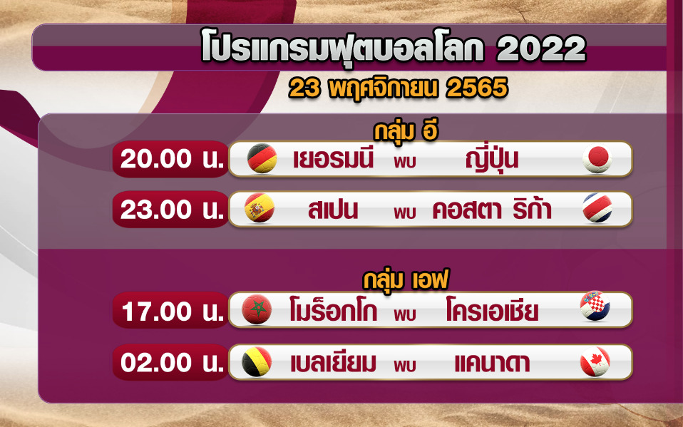 กาตาร์ 23 พ.ย.- ศึกฟุตบอลโลก คืนนี้ มีเตะอีก 4 คู่ ลุ้นญี่ปุ่นตัวแทนจากเอเชีย เก็บแต้มจากทัพ “อินทรีเหล็ก” เยอรมนี เวลา 20.00 น.