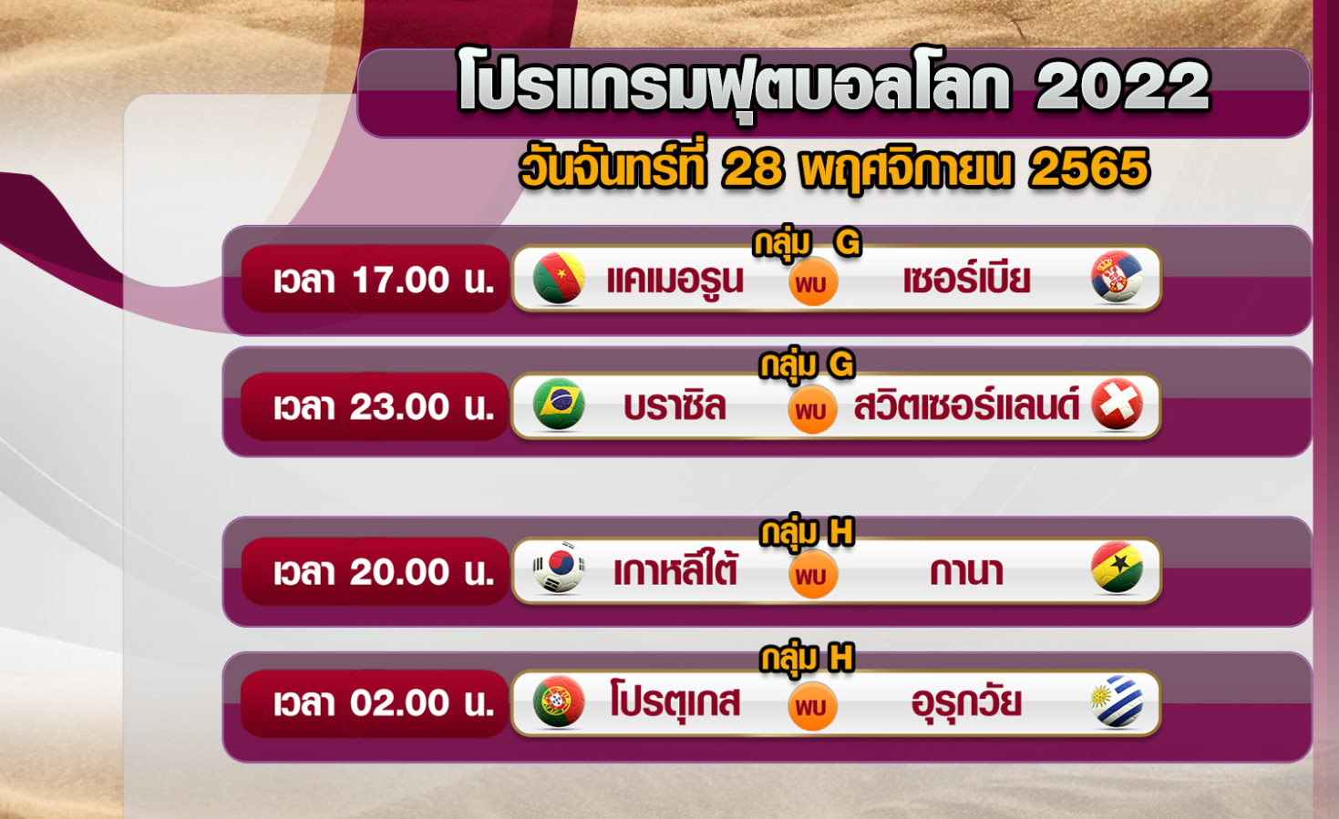 กาตาร์ 28 พ.ย.-ฟุตบอลโลก 2022 รอบแบ่งกลุ่ม วันนี้มีเตะ 4 คู่ เวลา 23.00 น. บราซิล พบ สวิตเซอร์แลนด์ เกมนี้ทีมแซมบ้า จะหมดสิทธิ์ใช้งาน เนย์มาร์ เจ็บข้อเท้า ส่วนเวลา 02.00 น. โปรตุเกส พบ อุรุกวัย