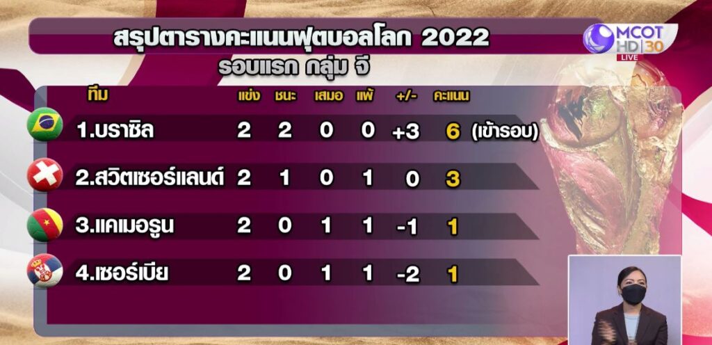 ฟุตบอลโลก 2022 ที่ประเทศกาตาร์ รอบแรก นัดที่สอง กลุ่มจี บราซิล แชมป์โลก 5 สมัย เสื้อสีเหลือง พบกับสวิตเซอร์แลนด์ ครึ่งแรกเสมอกันอยู่ 0-0 ครึ่งหลังนาทีที่ 64 วินิซิอุส จูเนียร์ หลุดเข้าไปยิงตุงตาข่ายให้บราซิลก่อน แต่เช็ก VAR เป็นจังหวะล้ำหน้าไปก่อน พลาดขึ้นนำไปอย่างน่าเสียดาย อย่างไรก็ตาม นาที 83 บราซิล มาได้ประตูชัยจาก คาเซมิโร ช่วยให้บราซิล ชนะ สวิตเซอร์แลนด์ 1-0 มี 6 คะแนน เป็นจ่าฝูงกลุ่มของกลุ่ม และผ่านเข้ารอบ 16 ทีมสุดท้ายแน่นอนแล้ว แม้จะเหลือเกมอีก 1 นัด และทำสถิติไม่แพ้ใครในรอบแบ่งกลุ่มถึง 17 นัด ชนะ 14 เสมอ 3