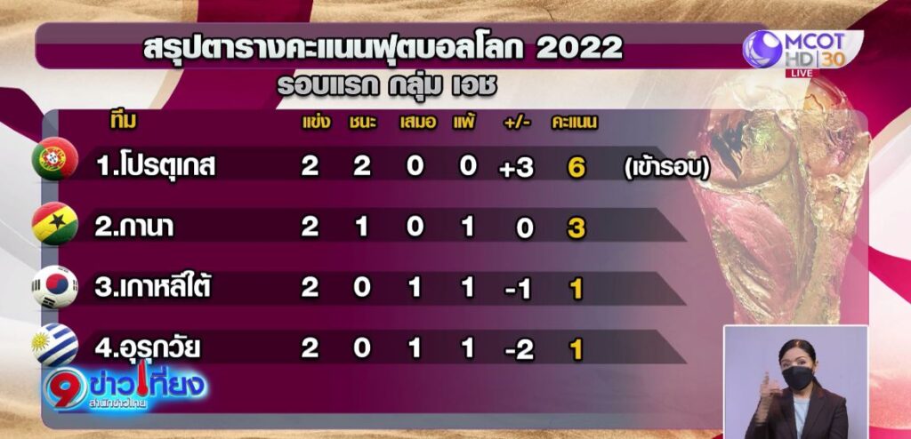 29 พ.ย. – คาเซมิโร ยิงประตูชัยช่วยให้บราซิลชนะ สวิตเซอร์แลนด์ ผ่านเข้ารอบ 16 ทีม ส่วนโปรตุเกส ชนะ อุรุกวัย ผ่านเข้ารอบสองเช่นกัน ติดตามในช่วง 9 ทันบอลโลก 2022
