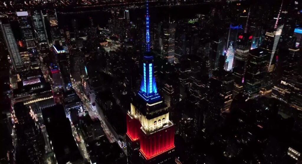 ตึกเอ็มไพร์สเตต จัดไฟสว่างไสวด้วยสีแดง ขาว และน้ำเงิน ซึ่งเป็นสีประจำทีมชาติสหรัฐ เพื่อเฉลิมฉลองชัยชนะครั้งแรกของประเทศในฟุตบอลโลก 2022 หลังผ่านเข้ารอบ 16 ทีมสุดท้าย