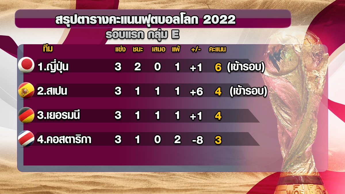 ต่อกันที่กลุ่ม E ที่ลงสนามในเวลา 02.00 น. ญี่ปุ่น ที่มี 3 คะแนน ลงสนามพบกับ “กระทิงดุ” สเปน ที่มี 4 คะแนน โดยกลุ่มนี้ยังมีโอกาสเข้ารอบทุกทีม สเปน ขอแค่แต้มเดียวก็จะผ่านเข้ารอบ แต่หากชนะได้ก็จะการันตีแชมป์กลุ่มทันที ส่วน ญี่ปุ่น ที่รั้งรองจ่าฝูง ต้องการ 3 แต้ม เพื่อเข้ารอบน็อกเอาต์ แต่ถ้าเสมอก็ต้องลุ้นผลอีกคู่ให้เสมอเช่นกัน หรือให้ เยอรมนี ชนะแค่ลูกเดียว