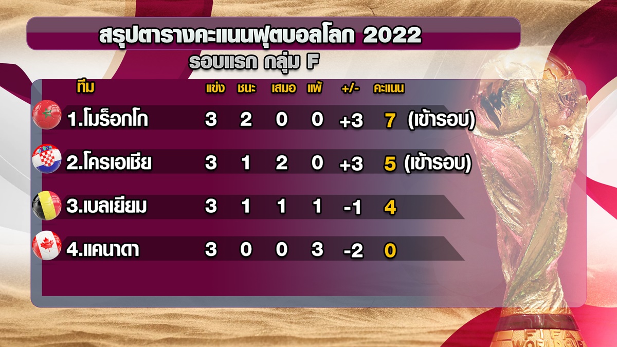ผลการแข่งขันฟุตบอลโลก 2022 รอบแบ่งกลุ่ม นัดสุดท้าย เริ่มกันที่ช่วง 22.00 น. กลุ่ม F คู่บิ๊กแมตช์ ระหว่าง เบลเยียม ปะทะ โครเอเชีย เกมนี้ โครเอเชีย จ่าฝูงของกลุ่มที่มี 4 คะแนน ขอเพียงแค่เสมอก็เพียงพอต่อการผ่านเข้ารอบน็อกเอาต์ ด้าน เบลเยียม อันดับ 3 มี 3 คะแนน ต้องเอาชนะเพื่อไปลุ้นกับ โมร็อกโก ที่อยู่ในสายเดียวกัน
