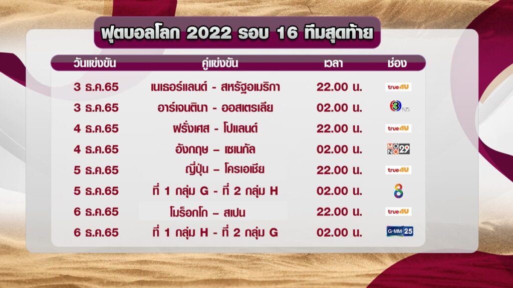 6 ธ.ค.65 เวลา 02.00 น. ที่ 1 กลุ่ม H – ที่ 2 กลุ่ม G : รับชมได้ทางช่อง GMM25. – สำนักข่าวไทย