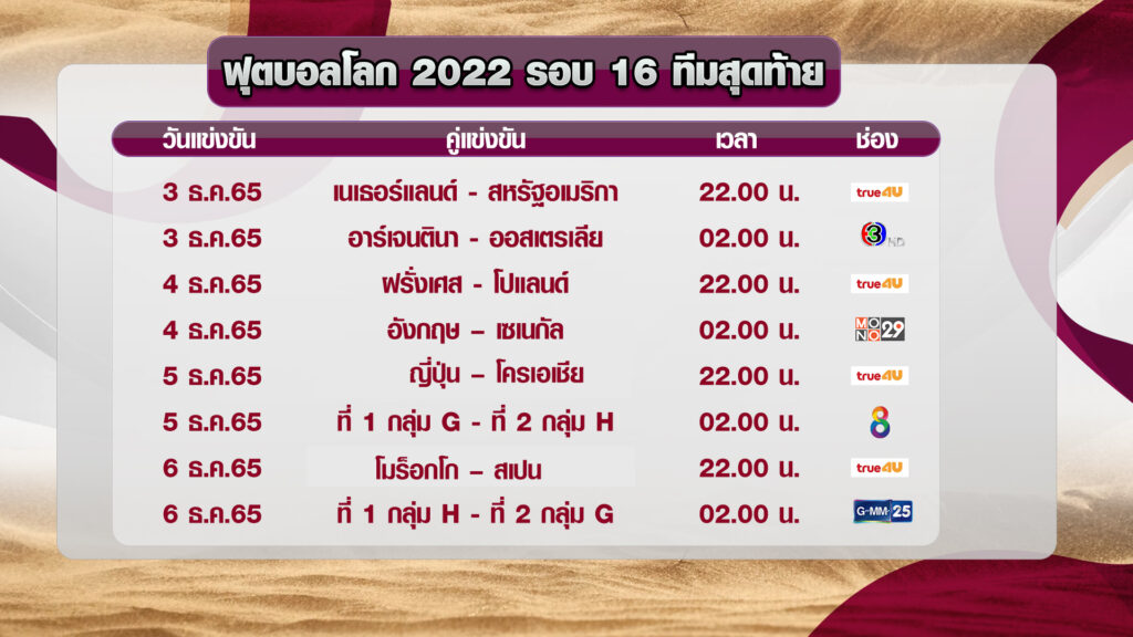 ฟุตบอลโลก 2022 คืนนี้ รอบแบ่งกลุ่ม นัดสุดท้าย สองกลุ่มสุดท้าย เวลา 22.00 น. กลุ่ม เอช กาน่า – อุรุกวัย และ เกาหลีใต้ – โปรตุเกส เวลา 02.00 น. กลุ่มจี เซอร์เบีย – สวิตเซอร์แลนด์ และ แคเมอรูน – บราซิล