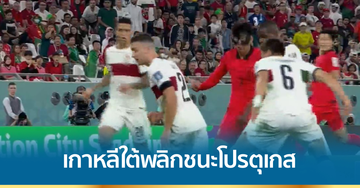 กาตาร์ 3 ธ.ค. – เกาหลีใต้สร้างปาฏิหาริย์ยิงช่วงทดเวลาบาดเจ็บพลิกเอาชนะโปรตุเกส 2-1 ผ่านเข้ารอบ 16 ทีมสุดท้ายเป็นทีมที่ 3 ของเอเชีย ส่วนบราซิลพลิกแพ้แคเมอรูน แต่ยังเข้ารอบ ศึกฟุตบอลโลก 2022
