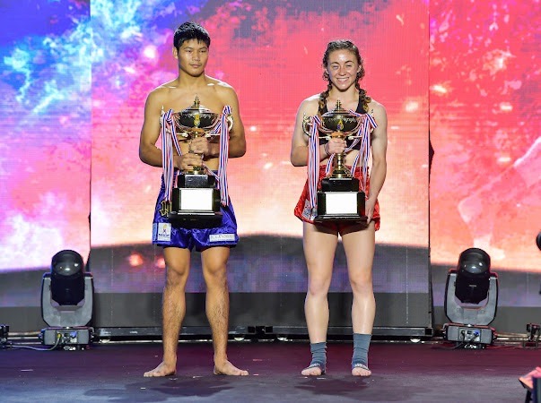 ขณะที่ เบรนิน มาเนอร์ นักชกสาวจากสหรัฐอเมริกา เตะปลายคางชนะน็อก ฟ้าใส ส.นิตยา ยกที่ 3 คว้าถ้วยรางวัลพระราชทานสมเด็จพระนางเจ้าฯ พระบรมราชินี ไปครอง