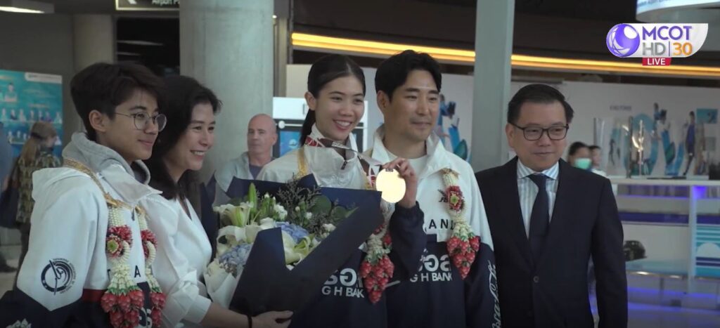 นายธนฑิตย์ รักตะบุตร เลขาธิการสมาคมกีฬาเทควันโดแห่งประเทศไทย พร้อมด้วยนางตระการตา ศรีวิกรม์ ภรรยานายกสมาคมกีฬาเทควันโดไทยฯ เดินทางมาต้อนรับและร่วมแสดงความยินดีกับ “น้องเทนนิส” เรืออากาศตรีหญิง พาณิภัค วงศ์พัฒนกิจ นักเทควันโดหมายเลข 1 ของโลก ที่คว้าแชมป์รุ่น 49 กิโลกรัมหญิง ศึกเทควันโดเวิลด์ กรังด์ปรีซ์ ไฟนอล ที่กรุงริยาด ประเทศซาอุดีอาระเบีย ซึ่งเป็นแชมป์ที่ 5 จาก 8 รายการที่ลงแข่งขันในปี 2022 ส่งผลให้ “น้องเทนนิส” คว้ารางวัลนักกีฬาเทควันโดหญิงยอดเยี่ยมแห่งปีของสหพันธ์เทควันโดโลกมาครองได้อีก 1 รางวัลด้วย โดย “น้องเทนนิส” เดินทางกลับมาถึงท่าอากาศยานสุวรรณภูมิ เมื่อช่วงบ่ายที่ผ่านมา พร้อมด้วย “โค้ชเช” ชัชชัย ชเว หัวหน้าผู้ฝึกสอนเทควันโดทีมชาติไทย และ “น้องเล็ก” ชนาธิป ซ้อนขำ ผู้ช่วยผู้ฝึกสอน ด้วยสายการบินเอมิเรตส์แอร์ไลน์ เที่ยวบิน EK376