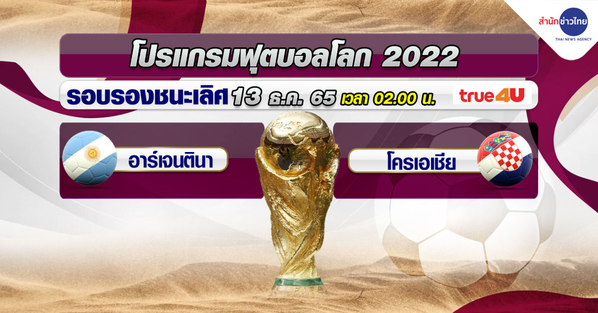 สำหรับโปรแกรมฟุตบอลโลก 2022 คืนวันที่ 13 ธันวาคม รอบรองชนะเลิศ คู่แรก เวลา 02.00 น. อาร์เจนตินา พบ โครเอเชีย ที่ลูเซล สเตเดียม วันที่ 14 ธันวาคม รอบรองชนะเลิศ คู่ที่ 2 เวลา 02.00 น. ฝรั่งเศส แชมป์เก่า พบ โมร็อกโก ที่อัล บายท์ สเตเดียม .-สำนักข่าวไทย