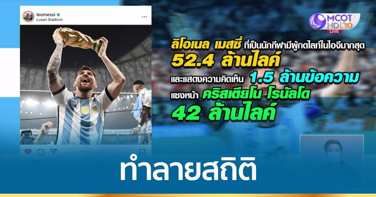 ลิโอเนล เมสซี กัปตันทีมชาติอาร์เจนตินา ที่เพิ่งพาทีมชาติอาร์เจนตินาคว้าแชมป์ฟุตบอลโลก 2022 สมัยที่ 3 ในรอบ36 ปี สร้างสถิติเป็นนักกีฬาที่มีผู้กดไลค์โพสต์บนอินสตาแกรม มากที่สุดถึง 52.4 ล้านไลค์ ทำลายสถิติเดิมของคริสเตียโน โรนัลโด นักเตะทีมชาติโปรตุเกส ที่เคยทำเอาไว้ที่ 42 ล้านไลค์ จากการโพสต์รูปที่เล่นหมากรุกกับเมสซี