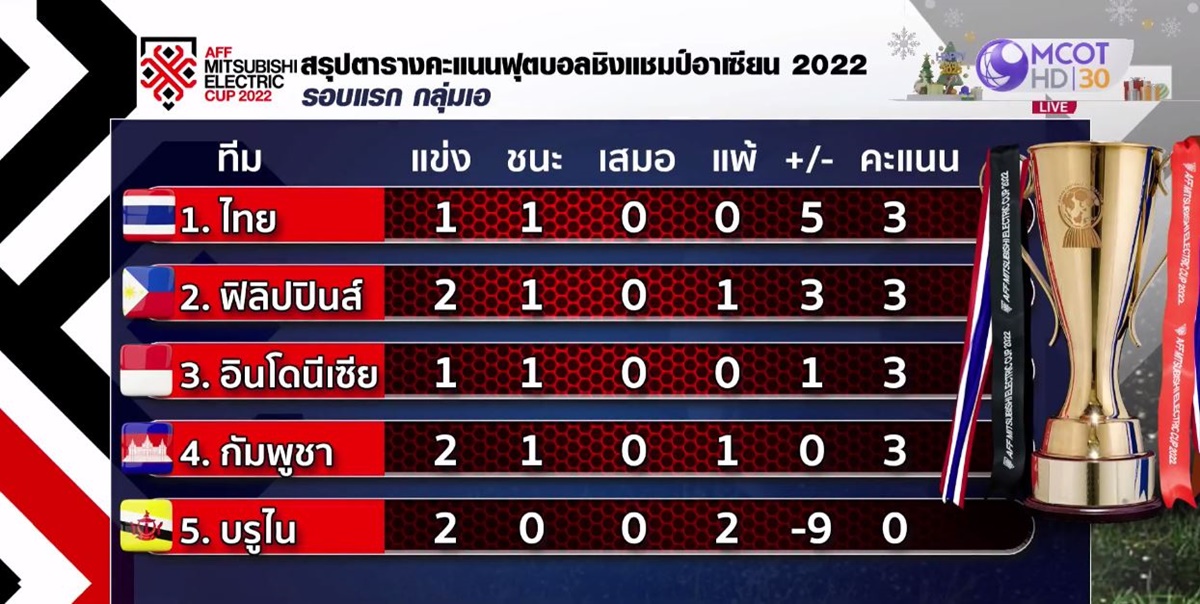 สรุปตารางคะแนนของกลุ่มเอ ทีมชาติไทย รั้งจ่าฝูง แข่ง 1 นัด ชนะ 1 ยังไม่เสียประตู มี 3 คะแนน อันดับ 2 ฟิลิปปินส์ แข่ง 2 นัด ชนะ 1 แพ้ 1 มี 3 คะแนน อันดับ 3 อินโดนีเซีย แข่ง 1 นัด ชนะ 1 มี 3 คะแนน อันดับ 4 กัมพูชา แข่ง 2 นัด ชนะ 1 แพ้ 1 มี 3 คะแนน อันดับ 5 บรูไน แข่ง 2 นัด ยังไม่ชนะใคร