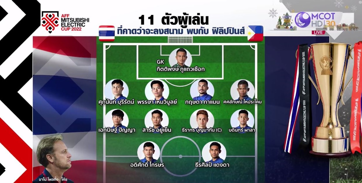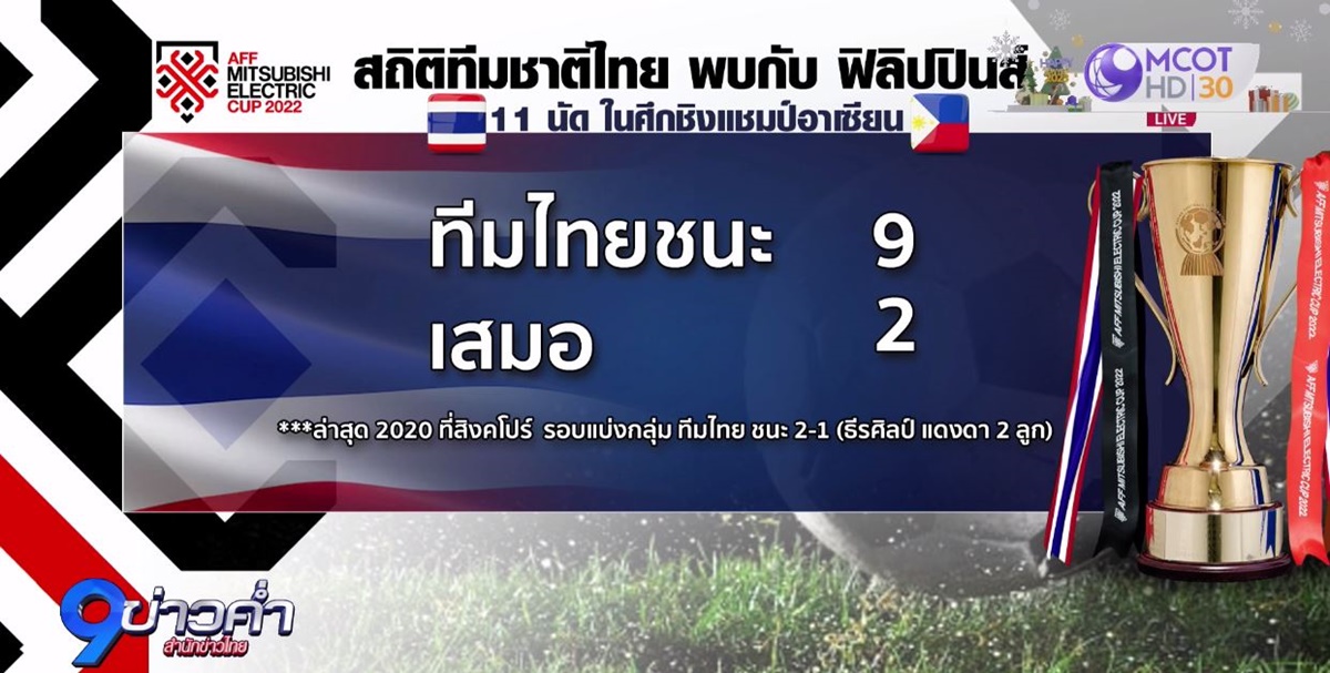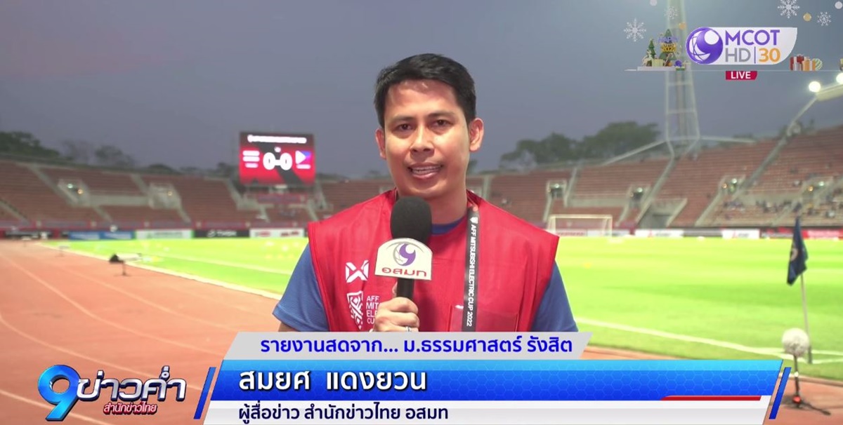 ย้ำโปรแกรมวันนี้ (26 ธ.ค.65) ทีมชาติไทย เจ้าของแชมป์อาเซียน 6 สมัย และแชมป์เก่า เปิดบ้านพบ ฟิลิปปินส์ ที่สนามธรรมศาสตร์ สเตเดียม เวลา 19.30 น. ถ่ายทอดสดทางช่อง 9 MCOT HD หมายเลข 30 แฟนบอลไทยพันธุ์แท้เตรียมส่งแรง “เชียร์สุดใจ” ให้ทีม “ช้างศึก” – สำนักข่าวไทย