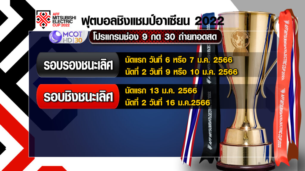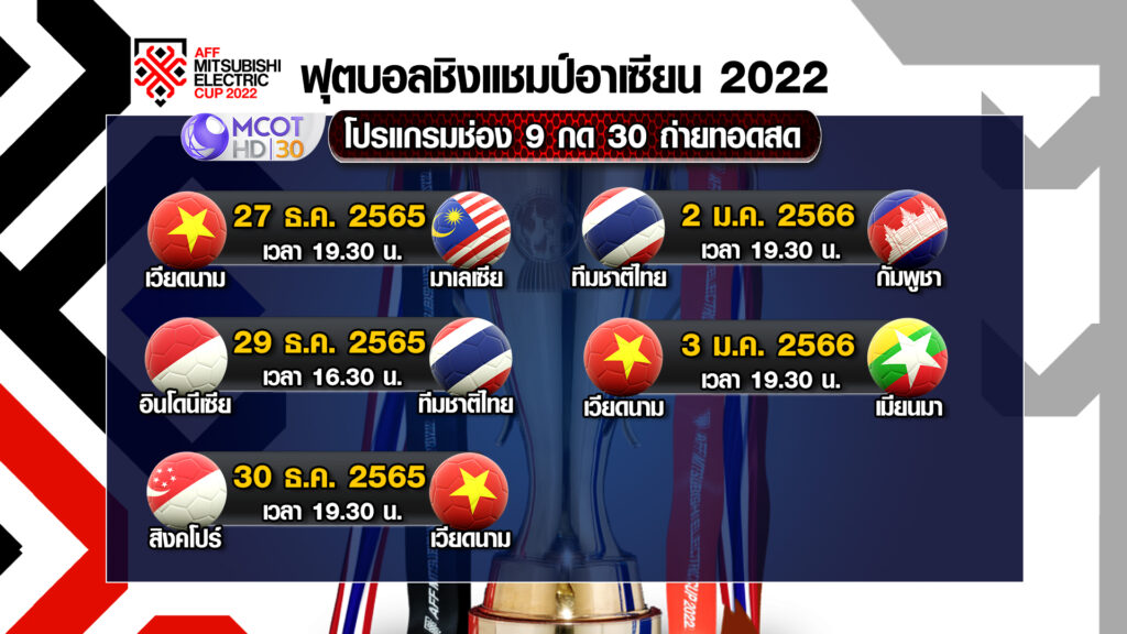 กทม. 27 ธ.ค.-ช่อง 9 กด 30 ถ่ายทอดสดต่อเนื่องรอบแรกอีก 5 แมตช์ ฟุตบอลชิงแชมป์อาเซียน “เอเอฟเอฟ มิตซูบิชิ อิเล็คทริก คัพ 2022” รวมทั้งรอบรองชนะเลิศ และรอบชิงชนะเลิศ