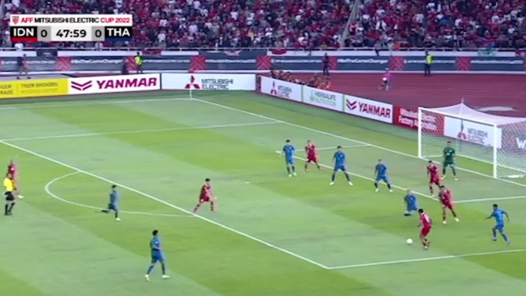 ครึ่งหลัง นาทีที่ 50 อินโดนีเซีย ได้จุดโทษเมื่อ อัสนาวี่ ยิงบอลไปติดแขน ธีราทร บุญมาทัน ก่อนที่ มาร์ก คล็อก จะสังหารไม่พลาดให้อินโดนีเซียนำไทยก่อน 1-0