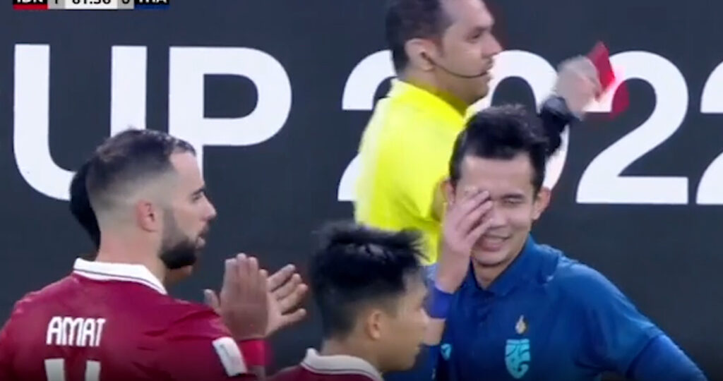 จากนั้นสถานการณ์ไทยแย่ลงอีกเมื่อ สรรวัชญ์ เดชมิตร ตัวสำรองที่ลงไปครึ่งหลัง โดนใบแดงนาทีที่ 63 หลังไปยกเท้าสูงเสียบใส่ ซัดดิล รัมดานี แต่ช้างศึกที่เหลือ 10 คน ตีเสมอได้สำเร็จนาทีที่ 79 สารัช อยู่เย็น ยิงนอกกรอบแฉลบแเข้าไป ก่อนจบเกมเสมอ 1-1 แบ่งทีมละ 1 แต้ม มี 7 แต้มเท่ากัน ไทยยังนำจ่าฝูง