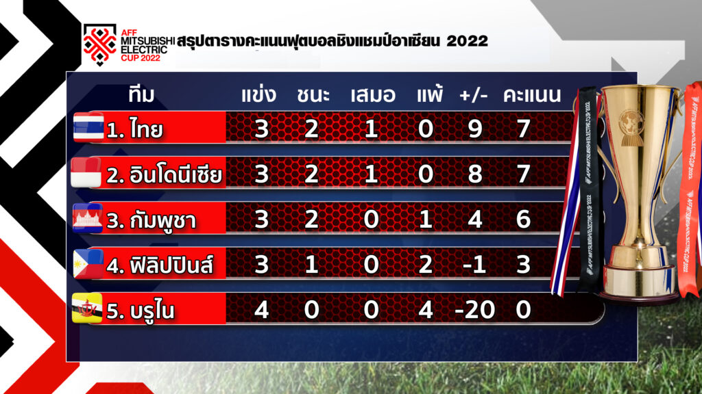 ทำให้สถานการณ์ตารางคะแนน ทีมชาติไทย ยังนำเป็นจ่าฝูง มี 7 คะแนนจาก 3 นัด เท่ากับอินโดนีเซีย ทีมอันดับ 2 แต่ประตูได้-เสียดีกว่า ส่วนกัมพูชา ที่เมื่อวานนี้ เอาชนะบรูไน 5-1 ขยับขึ้นมารั้งอันดับ 3 มี 6 คะแนน ยังมีลุ้นเข้ารอบ
