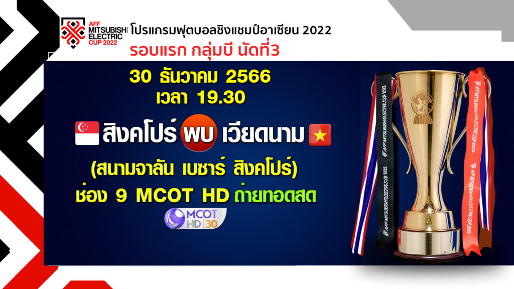 ย้ำอีกครั้งค่ำวันนี้ เวลา 19.30 น. เปิดช่อง 9 กดหมายเลข 30 ชมฟุตบอลชิงแชมป์อาเซียน กลุ่มบี สิงคโปร์ ทีมอันดับ 3 จะเปิดบ้านพบ เวียดนาม ทีมจ่าฝูง.-สำนักข่าวไทย