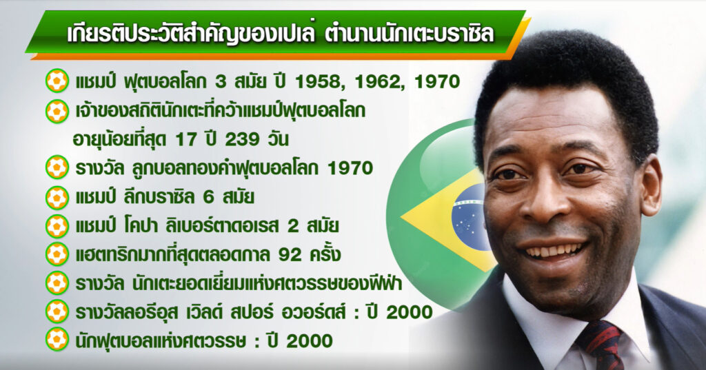 กทม. 30 ธ.ค.-พาไปย้อนดูผลงานของ “เปเล่” อดีตตำนานนักฟุตบอลทีมชาติบราซิล ที่เสียชีวิตด้วยวัย 82 ปีหลังจากป่วยมานาน
