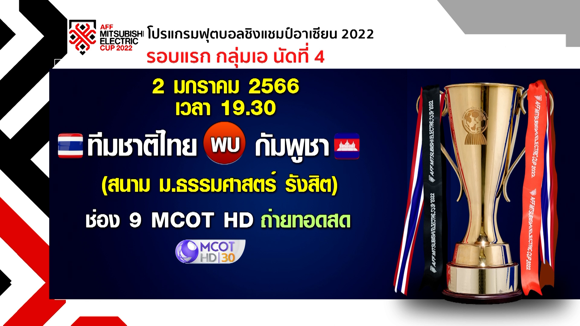 อินโดนีเซีย 31 ธ.ค.- ขุนพลช้างศึก เดินทางกลับถึงไทย ก่อนที่จะลงสนามพบกัมพูชา 2 ม.ค.นี้ โดยช่อง 9 MCOT HD หมายเลข 30 เตรียมถ่ายทอดสด