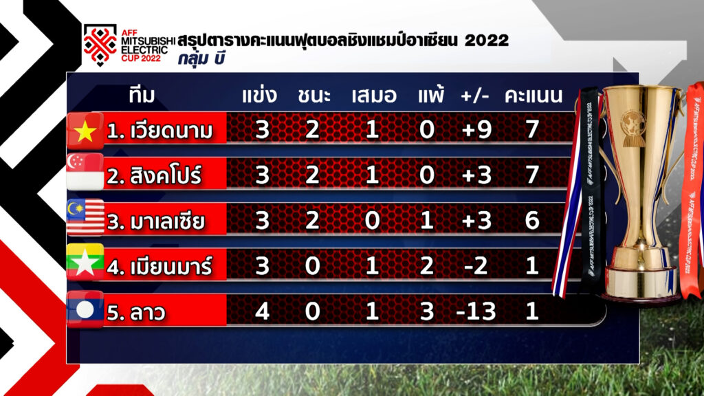สรุปสถานการ์กลุ่มนี้ เวียดนาม นำจ่าฝูงมี 7 คะแนนเท่ากับ สิงคโปร์ แต่ประตูได้เสียดีกว่า อันดับ 3 มาเลเซีย 6 คะแนน และเมียนมา กับ ลาว มี 1 คะแนน .-สำนักข่าวไทย