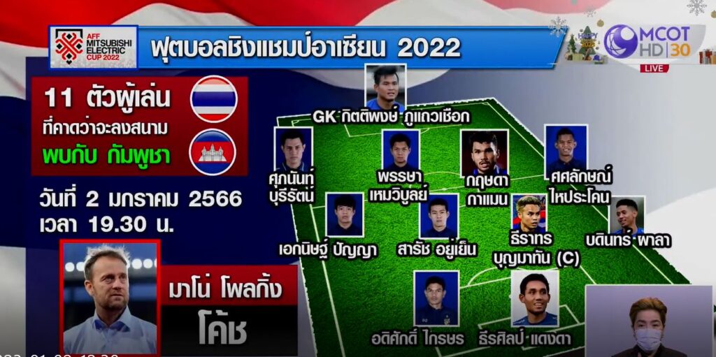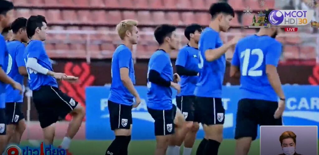 ความเคลื่อนไหวฟุตบอลชายทีมชาติไทย จ่าฝูงของกลุ่มเอ จากการลงสนาม 3 นัด มี 7 คะแนน เมื่อเย็นวานนี้ (1 ม.ค.) มาโน โพลกิ้ง นำนักเตะลงซ้อมที่สนามธรรมศาสตร์ สเตเดียม เตรียมความพร้อมและทบทวนแท็กติกก่อนจะพบกัมพูชา ทีมอันดับ 3 ที่ลงสนาม 3 นัด มี 6 คะแนน ศึกฟุตบอลชิงแชมป์อาเซียน “เอเอฟเอฟ มิตซูบิชิ อิเล็คทริคคัพ 2022” รอบแรก กลุ่มเอ นัดที่ 4 วันนี้ (2 ม.ค.) เวลา 19.30 น. ช่อง 9 MCOT HD หมายเลข 30 จะถ่ายทอดสดให้ชมตั้งแต่เวลา 19.15 น.เป็นต้นไป