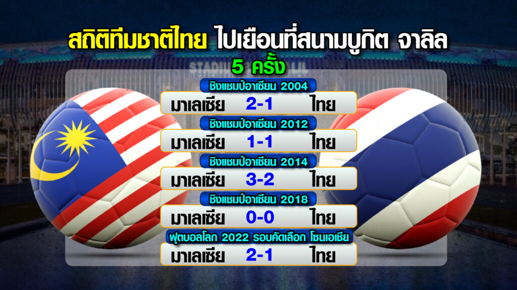 สำหรับการบุกไปเยือนที่สนามบูกิต จาลิล ผลงานของทีมชาติไทยไม่ดีนัก ลงเตะ 5 ครั้ง ไม่ชนะเลย เสมอ 2 แพ้ 3 ส่วนนัดล่าสุดที่พบกันในศึกฟุตบอลชิงถ้วยพระราชทานคิงส์คัพ จ.เชียงใหม่ เมื่อปีที่แล้ว ผลเสมอกันใน 90 นาที 1-1 และเป็นมาเลเซียชนะจุดโทษไปได้