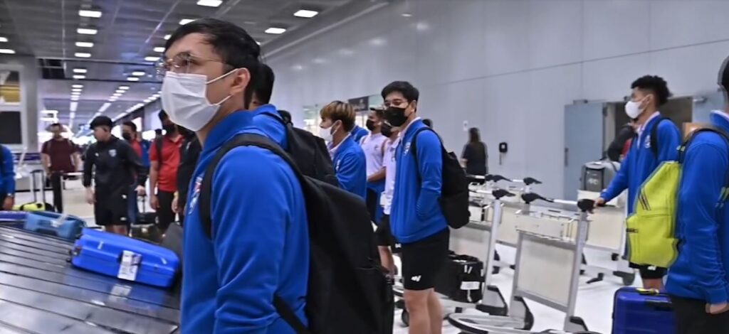 นักฟุตบอลทีมชาติไทย นำโดย “อุ้ม”ธีราทร บุญมาทัน กัปตันทีม “มุ้ย” ธีรศิลป์ แดงดา, “ตังค์”สารัช อยู่เย็น เดินทางกลับถึงประเทศไทยแล้วที่ท่าอากาศยานนานาชาติสุวรรณภูมิ หลังไปแข่งขันฟุตบอลชิงแชมป์อาเซียน “เอเอฟเอฟ มิตซูบิชิ อิเล็คทริค คัพ 2022” รอบรองรองชนะเลิศ นัดแรก แพ้มาเลเซียมาก่อน 0-1 และจะกลับมาเล่นในบ้านนัดที่ 2 ในวันที่ 10 มกราคม