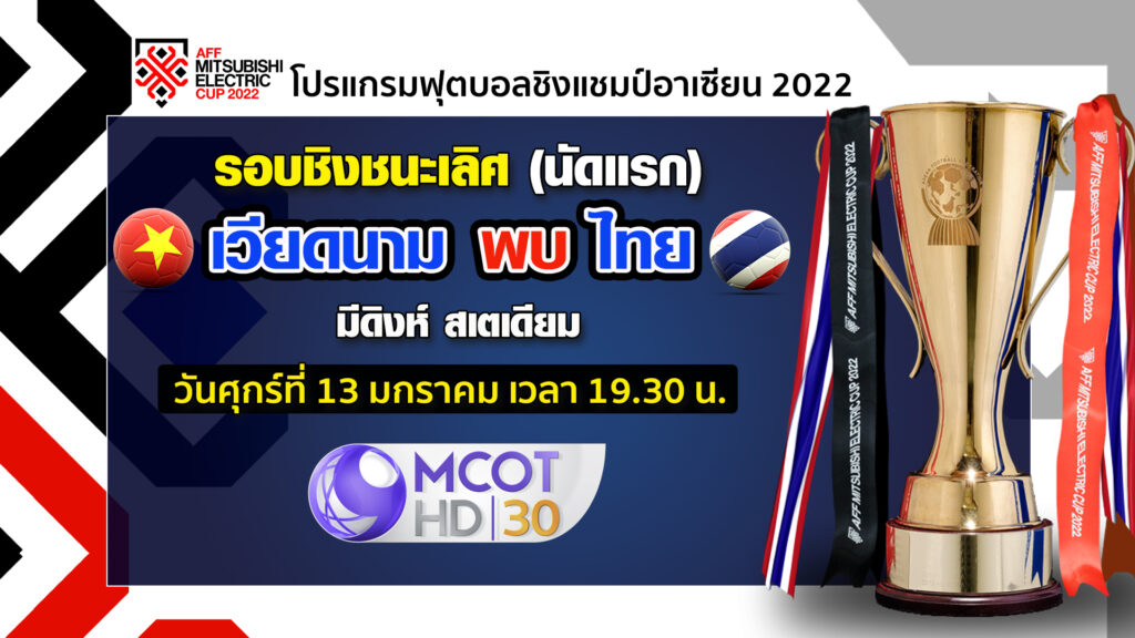 โปรแกรมฟุตบอลชิงแชมป์อาเซียน 2022 รอบชิงชนะเลิศ นัดแรก วันที่ 13 มกราคม เวลา 19.30 น. เวียดนาม พบ ไทย ที่มีดินห์ สเตเดียม