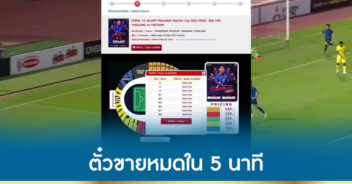 หลังจากThaiticketmajor ได้เปิดขายตั๋วเกมฟุตบอลชิงแชมป์อาเซียน “เอเอฟเอฟ มิตซูบิชิ อิเล็คทริค คัพ 2022” รอบชิงชนะเลิศ นัดที่ 2 ซึ่งไทยจะเปิดบ้านที่สนามธรรมศาสตร์ สเตเดียม พบกับ เวียดนาม ในวันที่ 16 มกราคม ตั้งเมื่อเวลา 10.00 น. ของวันนี้ ทางหน้าเว็บไซด์ ปรากฏว่า ตั๋วนัดนี้ถูกจำหน่ายหมดทุกโซน ทั้งโซน W ในราคา 600 บาท โซน E 450 บาท โซน S และN ราคา 250 บาท ถูกจำหน่ายหมดไปเป็นที่เรียบร้อยภายใน 5 นาที โดยสนามธรรมศาตร์ สเตเดียม มีความจุสนามราว 25,000 ที่นั่ง ซึ่งนัดล่าสุดที่ไทยเปิดบ้านเอาชนะมาเลเซียในเกมรอบรองชนะเลิศ นัดที่ 2 มีแฟนบอลเข้ามา 18,927 คน