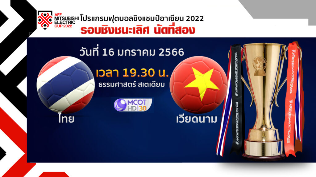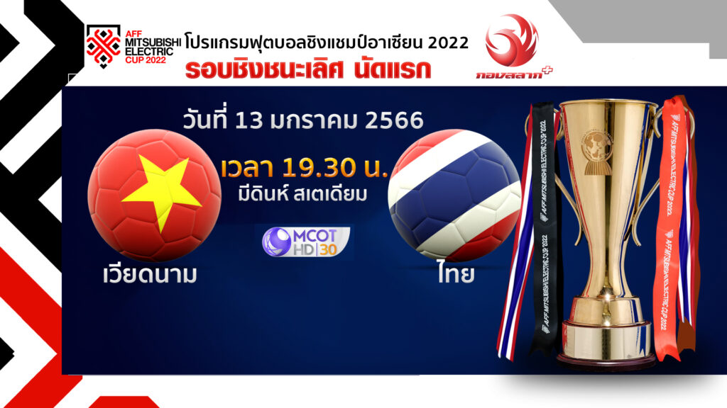โปรแกรม ฟุตบอลชิงแชมป์อาเซียน 2022 รอบชิงชนะเลิศ นัดแรก วันที่ 13 มกราคม เวลา 19.30 น. เวียดนาม พบ ไทย ที่มีดินห์ สเตเดียม