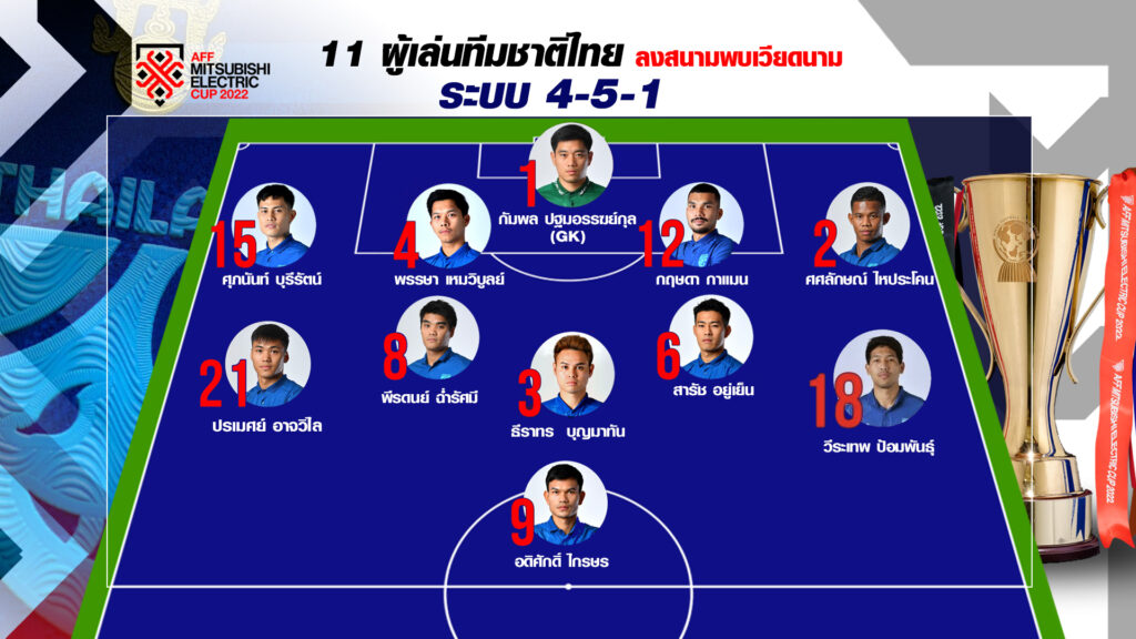 สำหรับ 11 คนแรกของไทย ผู้รักษาประตู กัมพล ปฐมอรรฆย์กุล, คู่เซ็นเตอร์ พรรษา เหมวิบูลย์, กฤษดา กาแมน, แบ็กซ้าย ศศลักษณ์ ไหประโคน, แบ็กขวา ศุภนันท์ บุรีรัตน์, กองกลาง ธีราทร บุญมาทัน, พีรดนย์ ฉ่ำรัศมี, วีระเทพ ป้อมพันธุ์, สารัช อยู่เย็น และปรเมศย์ อาจวิไล ส่วนกองหน้า อดิศักดิ์ ไกรษร ลงแทนธีรศิลป์ แดงดา ที่มีอาการบาดเจ็บรบกวน