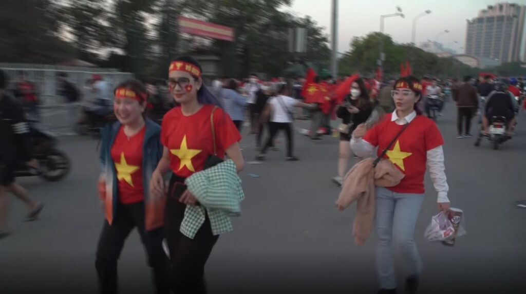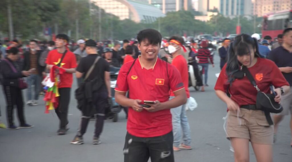 บรรยากาศที่หน้าสนามมีดินห์ สเดียม กรุงฮานอย ประเทศเวียดนาม ก่อนที่ทีมชาติไทยจะลงสนามฟุตบอลชิงแชมป์อาเซียน “เอเอฟเอฟ มิตซูบิชิ อิเล็คทริค คัพ 2022” รอบชิงชนะเลิศ นัดแรก กับทีมชาติเวียดนาม ในเวลา 19.30 น. แฟนบอลเวียดนามใส่เสื้อสีแดง สีประจำชาติ ทยอยเดินทางเข้ามาบริเวณสนาม เพื่อมาเชียร์ทีมรักของตัวเอง ขณะเดียวกันมีเจ้าหน้าที่รักษาความปลอดภัย คอยอำนวยความสะดวก และดูแลความเรียบร้อย ซึ่งบัตรเข้าชมวันนี้ได้จำหน่ายทางอินเตอร์เน็ตเกือบ 40,000 ใบ หมดไปแล้ว แต่มีพ่อค้าแม่ค้าบางส่วนซื้อมาเกร็งกำไรมาจำหน่ายหน้าสนาม ตั้งแต่เมื่อคืนวานนี้ จนถึงตอนนี้ ซึ่งบัตรราคาหน้าตั๋วอยู่ที่ 8 แสนดอง ประมาณ 1,130 บาท แต่ขายเกินราคาอยู่ที่ 1.5 ล้าน ดอง ประมาณ 2,120 บาท แพงสุดขายถึง 4 ล้านดอง ประมาณ 5,000 บาท