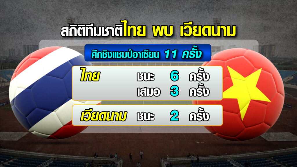 สถิติทีมชาติไทย พบกับ เวียดนาม 11 ครั้งในศึกชิงแชมป์อาเซียน ทีมไทย ชนะ 6 ครั้ง เสมอ 3 ครั้ง แพ้ 2 ครั้ง ส่วนรอบชิงชนะเลิศเคยพบกัน 1 ครั้งในปี 2008 ทีมไทยแพ้เวียดนาม สกอร์รวม 2 นัด 3-2 โดยทีมไทย แพ้ ในบ้าน 1-2 และบุกมาเสมอที่มีดินห์ สเตเดียม 1-1