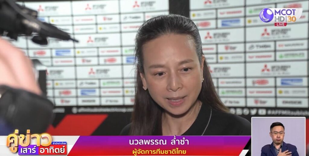ขณะที่ “มาดามแป้ง” นวลพรรณ ล่ำซำ ผู้จัดการทีมชาติไทย เปิดเผยว่า ตอนโดนนำได้ปลุกใจนักเตะตอนพักครึ่งว่าเราเคยเป็นแชมป์รายการนี้ เราต้องกลับมาให้ได้เพื่อศักดิ์ศรี นอกจากนี้มาดามแป้งยังพูดถึงเกมนัดที่ 2 ด้วยว่าได้ข่าวว่าตั๋วขายหมดแล้ว คิดว่ากำลังใจกองเชียร์ไทยสำคัญมาก ขอให้แฟนบอลเข้ามาให้เต็มสนาม ถ้าเข้าสนามไม่ได้ขอให้ดูทางทีวี ร่วมส่งกำลังใจทีมชาติไทย