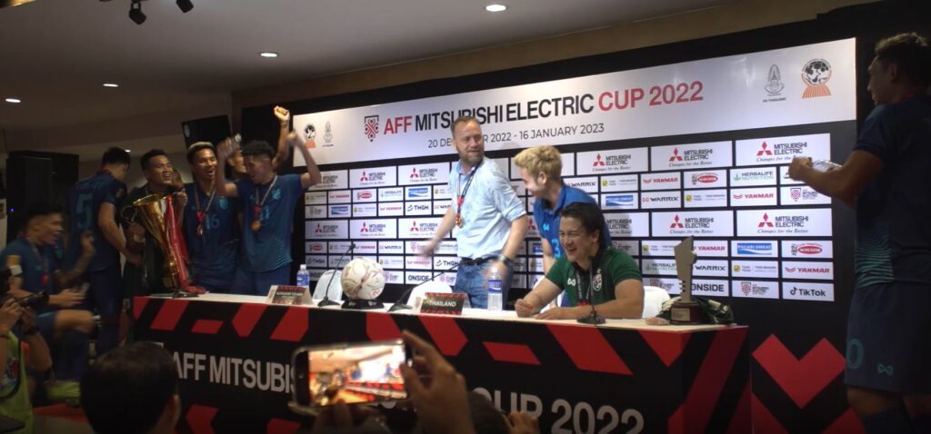 ขณะที่การแถลงข่าวหลังจบเกม เหล่านักเตะช้างศึกได้เข้ามาเซอร์ไพรส์ มาโน โพลกิง กุนซือทีมชาติไทย และธีราทร บุญมาทัน ด้วยการสาดน้ำยินดี และนำเอาถ้วยแชมป์มาตั้งภายในห้องแถลงข่าวด้วย