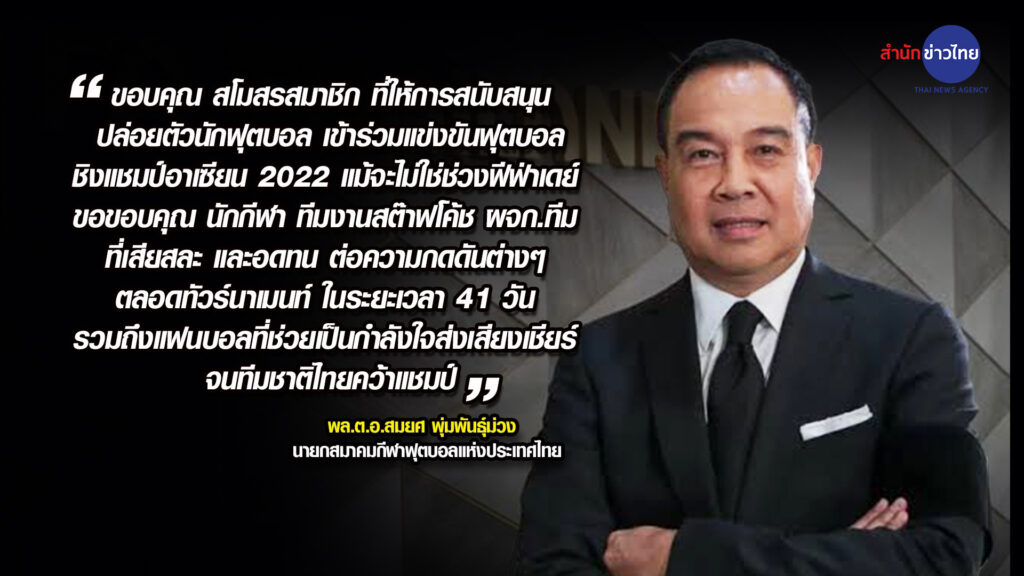 ด้าน “บิ๊กอ๊อด” พล.ต.อ.สมยศ พุ่มพันธุ์ม่วง นายกสมาคมกีฬาฟุตบอลแห่งประเทศไทย ได้ขอบคุณสโมสรที่ปล่อยนักเตะมาร่วมทำศึกชิงแชมป์อาเซียนครั้งนี้ แม้จะไม่ใช่อยู่ในช่วงฟีฟ่าเดย์ พร้อมขอขอบคุณนักเตะ สต๊าฟฟ์โค้ช ผู้จัดการทีม ที่เสียสละ ทุ่มเททั้งแรงกายแรงใจ ตอลดระยะเวลา 41 วัน รวมถึงแฟนบอลที่ช่วยเป็นกำลังใจส่งเสียงเชียร์ จนทีมไทยคว้าแชมป์ครั้งนี้ได้