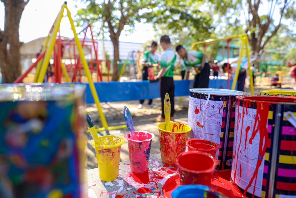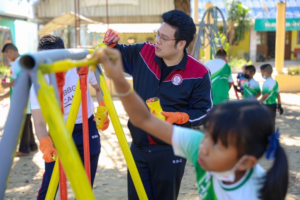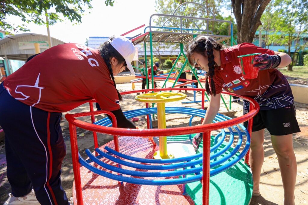 หลังจากทำกิจกรรมทาสี น้องๆ นักกีฬาสโมสรกีฬาบีบีจีและอาสาสมัครร่วมเล่นกีฬากับน้องๆ นักเรียนและคุณครู ทั้งเทเบิลเทนนิส ตะกร้อ รวมถึงเล่นเครื่องเล่นในสนามเด็กเล่นที่ร่วมกันเติมสีสันแล้ว อย่างสนุกสนาน