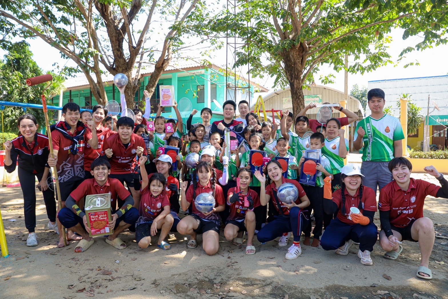 งานนี้ ทุกคนได้ร่วมกัน ซ่อมแซมปรับปรุงลานกีฬาอเนกประสงค์ ให้กลายเป็นสนามแบดมินตันและตะกร้อกลางแจ้งที่มีสีสันสวยงาม และทาสีสร้างสรรค์ลวดลายเครื่องเล่นในสนามเด็กเล่นร่วมกันกับน้องๆ นักเรียนโรงเรียนวัดถ้ำเข้ นอกจากนี้ยังได้มอบอุปกรณ์กีฬาให้น้องๆ ไว้ใช้เพื่อฝึกเล่น และพัฒนาตนเองในด้านกีฬาต่อไป